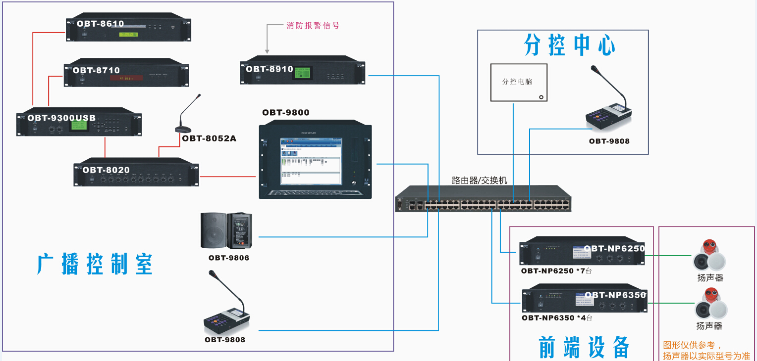 公共廣播設(shè)計按留上海悅興國際大酒店的功能劃分廣播分區(qū),每個分區(qū)設(shè)計一臺獨立功放,確保每個區(qū)域可以獨立的播放節(jié)目和獨立廣播講話;公共廣播系統(tǒng)采用OBT高集成多分區(qū)模塊式(插卡式)廣播系統(tǒng),高集成多分區(qū)模塊式(插卡式)廣播系統(tǒng)是一套支持64個信號分區(qū)的公共廣播系統(tǒng),系統(tǒng)由管理主機、控制模塊、管理模塊、消防信號發(fā)生模塊、消防智能接口模塊、MP3播放模塊、收音機模塊、輸出矩陣模塊、電話模塊等主要核心設(shè)備組成,解決了公共廣播的背景音樂播放、遠程尋呼廣播、消防應(yīng)急廣播、定時播放音樂等使用功能;高集成模塊式分區(qū)矩陣控制主機為系統(tǒng)的管理主機,主機內(nèi)置有控制模塊、管理模塊、消防信號發(fā)生模塊、消防智能接口模塊、MP3播放模塊、收音機模塊、輸出矩陣模塊、電話模塊等,系統(tǒng)最大支持8套節(jié)目輸出、64路節(jié)目輸出;主機連接管理軟件,可實現(xiàn)手動和自動控制節(jié)目播放,在軟件上可直觀操作64路輸出音樂播放,可實現(xiàn)電話廣播、無線遙控廣播功能,連接電源時序器,可手動或自動管理設(shè)備電源;主機最多可同時支持8臺遠程尋呼站工作,遠程尋呼站可以遠程尋呼講話,同時遠程對64路輸出音樂播放管理和控制;系統(tǒng)支持分控功能,除了在主控室安裝管理軟件,還可以在酒店的服務(wù)臺安裝遠程操作軟件,遠程播放節(jié)目,高集成板卡模塊設(shè)計,簡單的系統(tǒng)設(shè)備配置,眾多的使用功能,滿足酒店日常的背景音樂播放、自動節(jié)目播放、遠程尋呼、本地尋呼、遠程控制、火災(zāi)應(yīng)急廣播的使用。